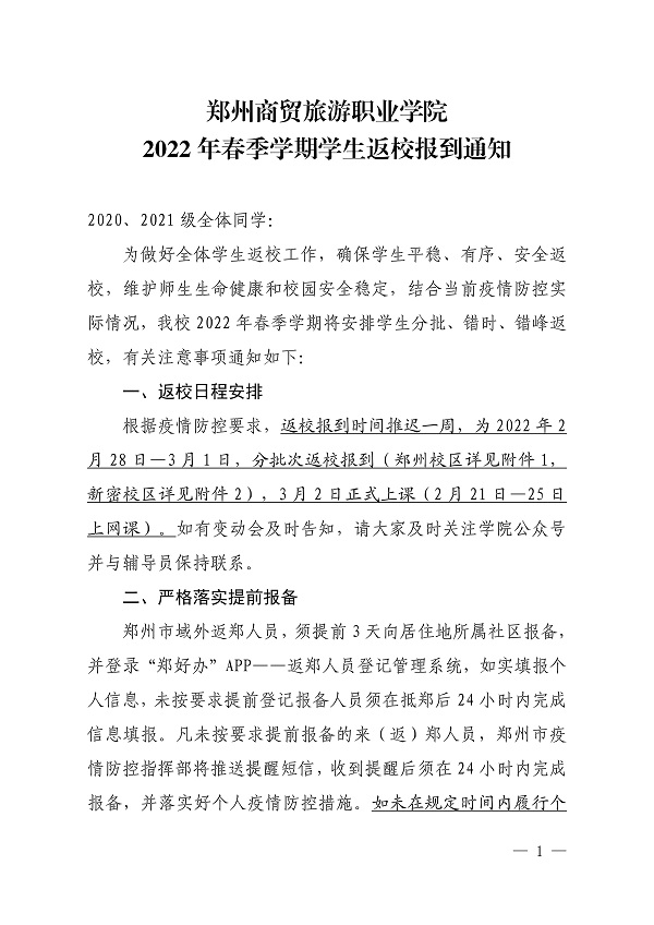 郑州商贸旅游职业学院2022年春季学期学生返校通知