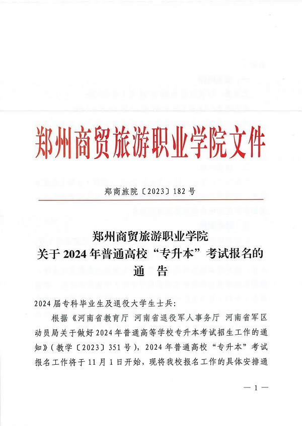 郑州商贸旅游职业学院关于2024年普通高校“专升本”考试报名的通告