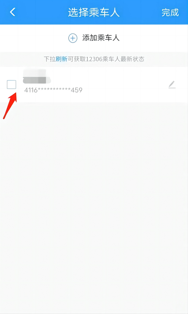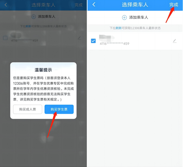 1.在“铁路 12306”APP 中确认出行信息后选择乘车人