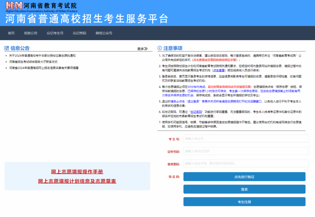 进入考生服务平台后,请仔细阅读“信息公告”区、“注意事项”区发布的政策公告和注意事项。