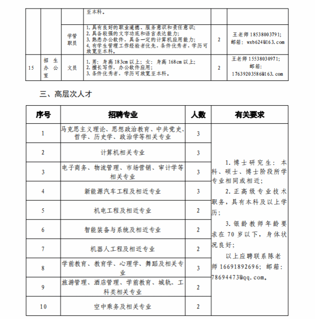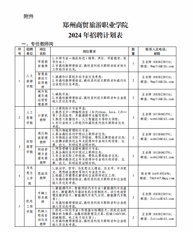专任教师、行政人员、高层次人才招聘岗位及相关要求详见郑州商贸旅游职业学院2024年招聘计划表(详见附件)。