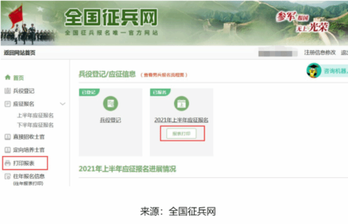 2021年报名信息可点击页面上方“2021年上半年应征报名下方的表格打印”或者页面左侧“往年报表打印”。女兵报名信息需初选通过后才可打印报表。