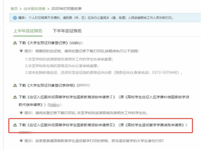 《应征入伍服兵役高等学校学生国家教育资助申请表II》填写及下载流程