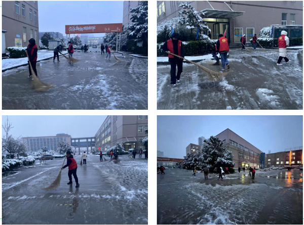 寒风阵阵,并没有阻挡老师与同学们扫雪的热情。他们充分发挥不怕苦、不怕累的精神,齐心协力、配合默契地在雪地里劳动着。即使双手冻的通红,但也丝毫没有影响他们劳动的热情。大家一边扫着雪,一边提醒来往的同学注意安全,很快就将积雪清理完毕,整个校园内充满了温暖和谐的气氛。大家劳动的热情和团结的力量让这个天气变得格外温暖。