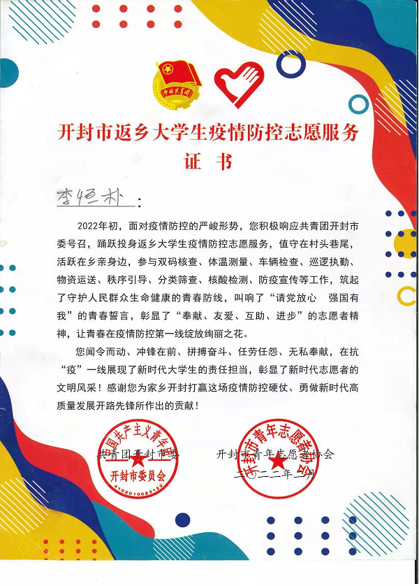 开封市青年志愿者协会向我校发来感谢信,感谢我校2021级JAVA专业1班李恒朴同学积极响应共青团开封市委号召,踊跃投身返乡大学生疫情防控志愿服务,彰显了“奉献、友爱、互助、进步”的志愿者精神。感谢他为家乡开封打赢这场疫情防控硬仗、勇做新时代高质量发展开路先锋所作出的贡献。