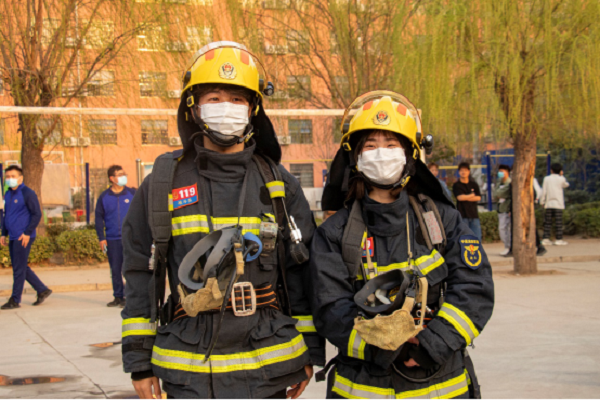 后勤处裴文浩、张心语同学体验消防服