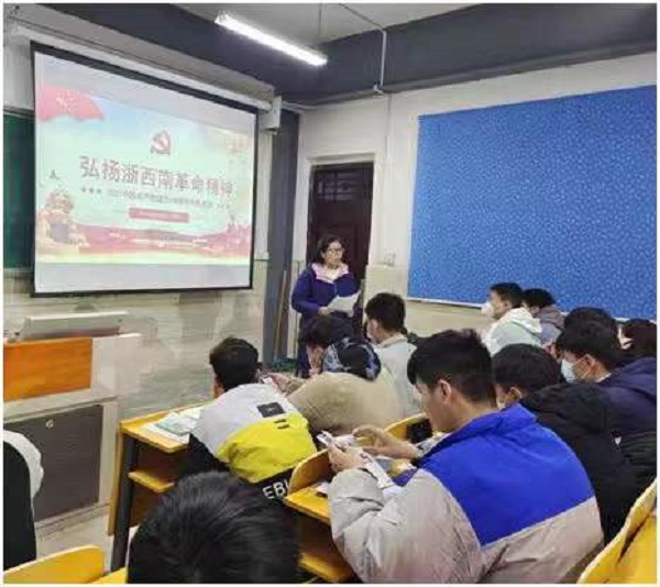 为庆祝中国共产党成立100周年,继承革命红色基因,传承革命精神,21级辅导员彭白鸽老师于12月7日在1001教室为建筑工程系的同学带来了“弘扬浙西南革命精神”的宣讲活动。本次宣讲活动共分五个环节,包括活动介绍、设疑引入、老师讲解、师生互动、合唱红歌。