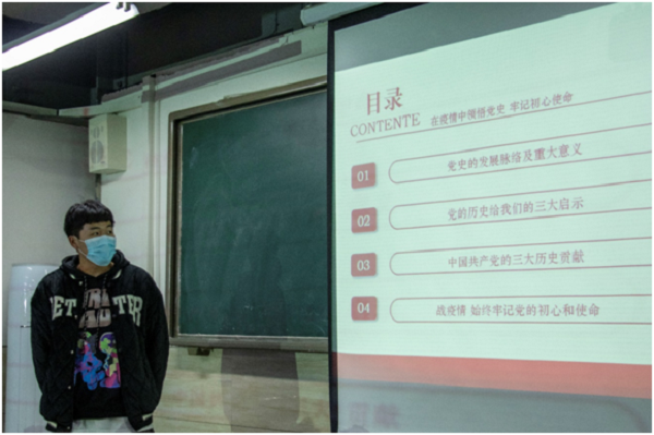 冀志鹏同学以《在疫情中领悟党史 牢记初心使命》为主题,为同学们上课一节生动有趣的党课。他以党史的发展脉络及重大意义、党的历史给我们的三大启示、中国共产党的三大历史贡献三个方面展开,向同学们分别介绍并讲解了中国共产党的成立、毛泽东思想的基本形成以及邓小平理论的成形,使同学们受益匪浅。他指出,作为新时代青年,要清楚自己的使命担当。在全球疫情肆虐的当前社会,更应该自觉把个人前途同国家命运相结合,在为实现中华民族伟大复兴中国梦贡献力量的实践中放飞青春梦想。