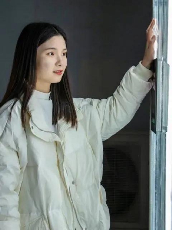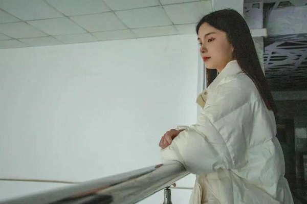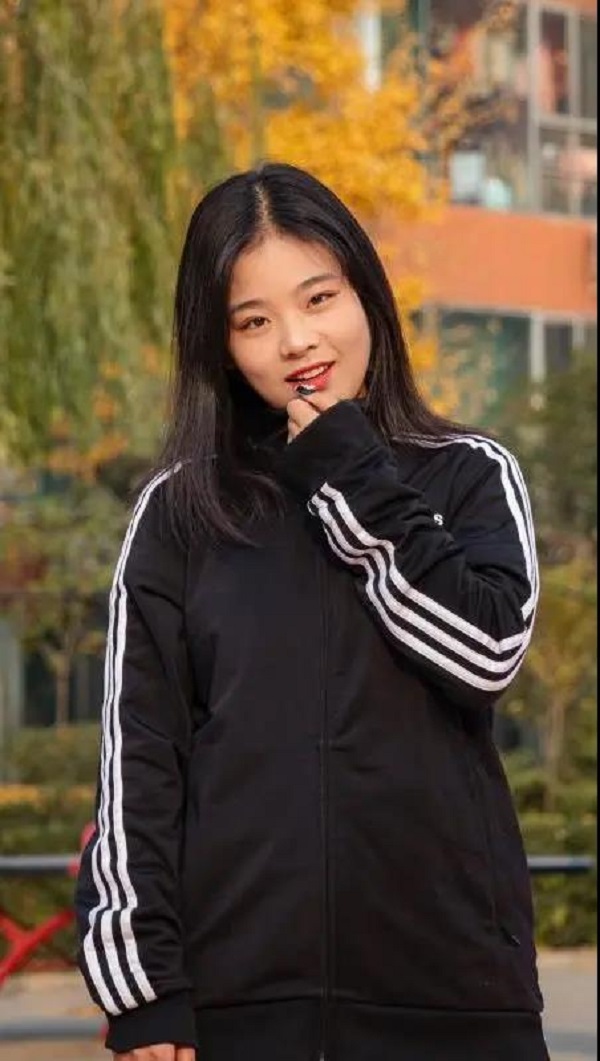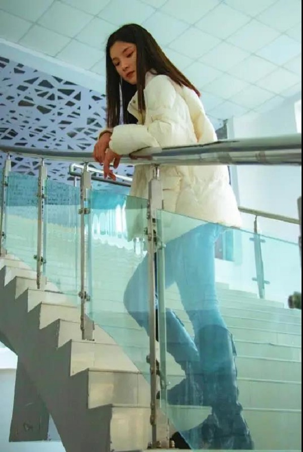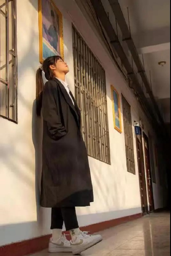 白色棉服外套与紧身牛仔裤相得益彰,简洁干练。一颦一蹙,给冬日的校园增添优雅与细腻。