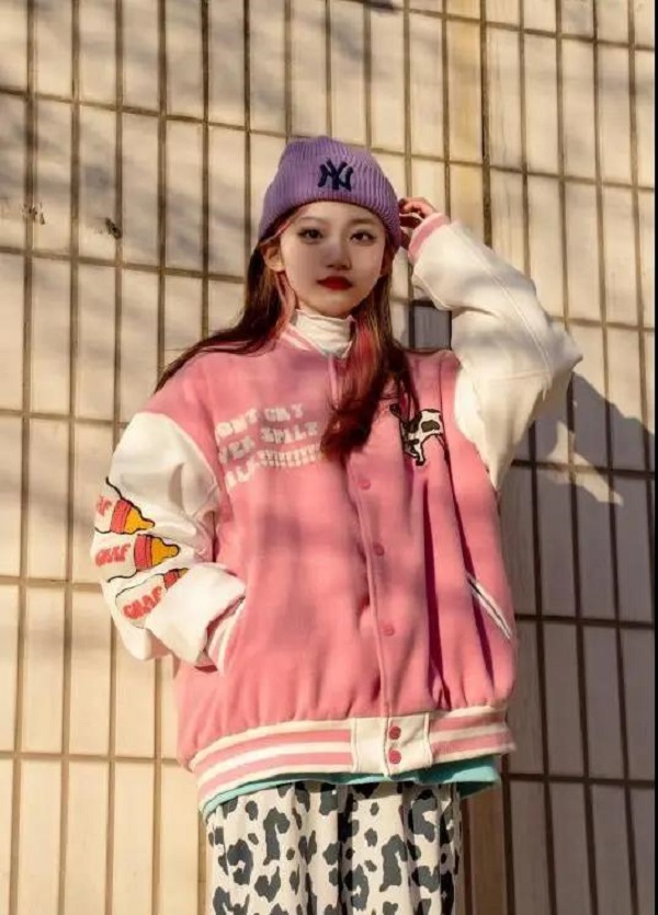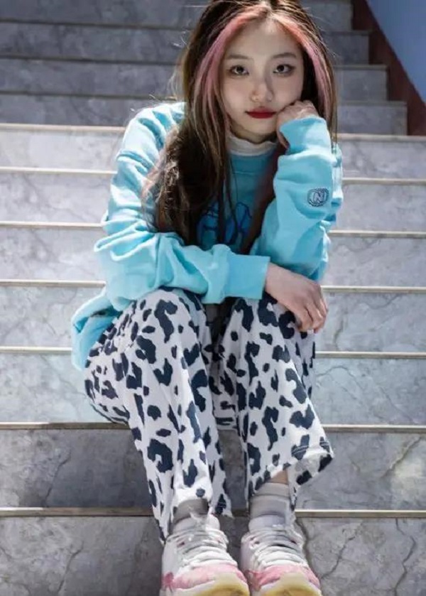 粉色外套俏皮可爱,紫色针织帽的撞色搭配更显少女灵气,奶牛花纹的裤子俏皮又充满活力,冬日依旧要元气满满呀。