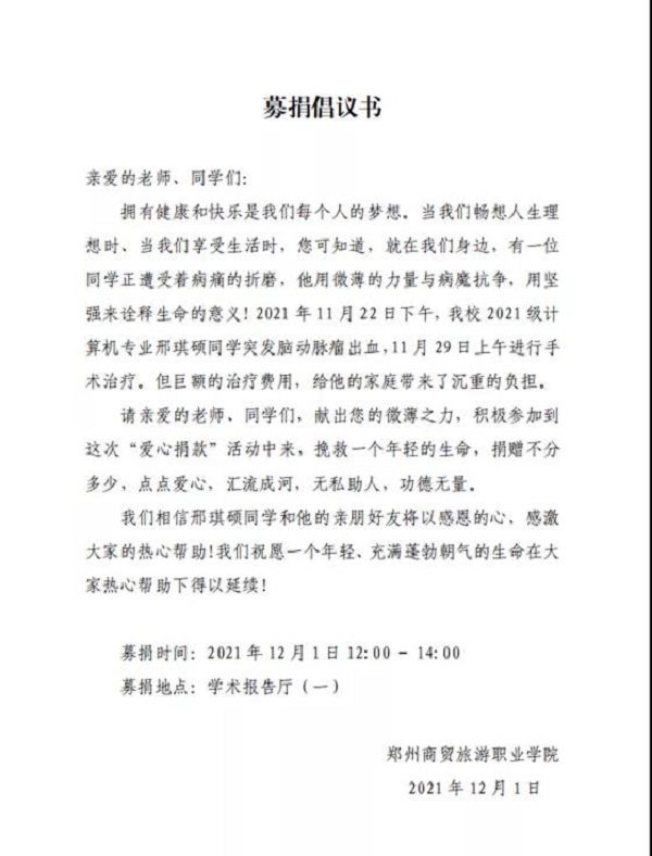11月22日下午,我校2021级计算机专业邢琪硕同学突发脑动脉瘤出血,11月29日上午进行手术治疗,但巨额的治疗费用,给他的家庭带来了沉重的负担。学校领导了解情况后,立即商量解决之策,向全校师生发布了募捐倡议书,号召全校师生为邢琪硕同学奉献爱心。