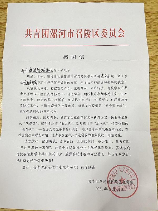 近日,我校收到了共青团漯河市召陵区委员会的感谢信。信中共青团漯河市召陵区委员会赞扬我校金融系学生徐璐璐在疫情防控期间对家乡做出的贡献。