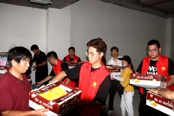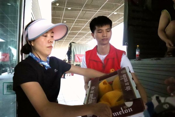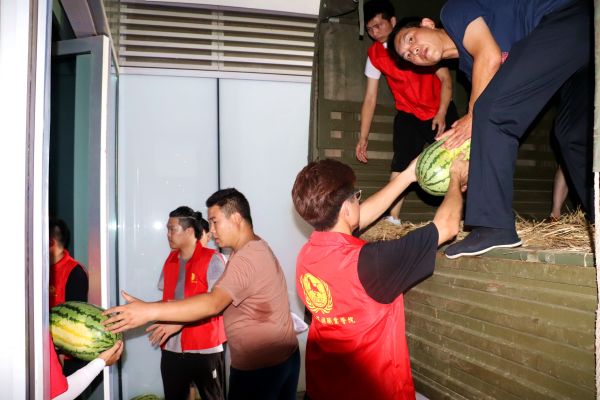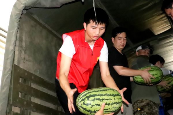 面对一辆辆装满救灾物资的大货车,身穿红马甲的志愿者们不顾炎炎酷暑搬运物资,他们分工明确、团结协作,铲水、消毒、搬运物资,抢险工作紧张而有序地进行着。