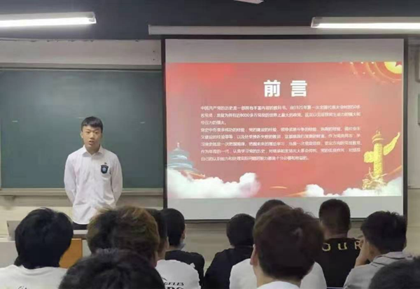 为丰富党史学习教育的内容与形式,推进党史学习教育走深走实,2021年6月22 日,我校党史学习教育专题宣讲在教学楼5001室开展,大学生党史宣讲团成员、信息工程系计算机一班程千禧担任主讲,计算机一班学生63人参加。