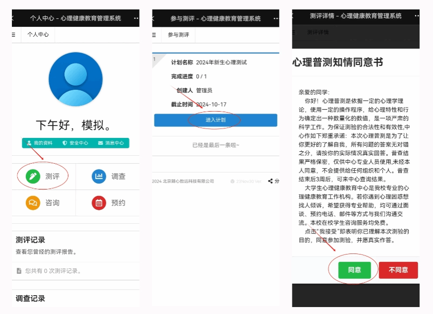 2.进入公众号,点击最下端“微校园”——“心理健康普测”——“继续访问”。