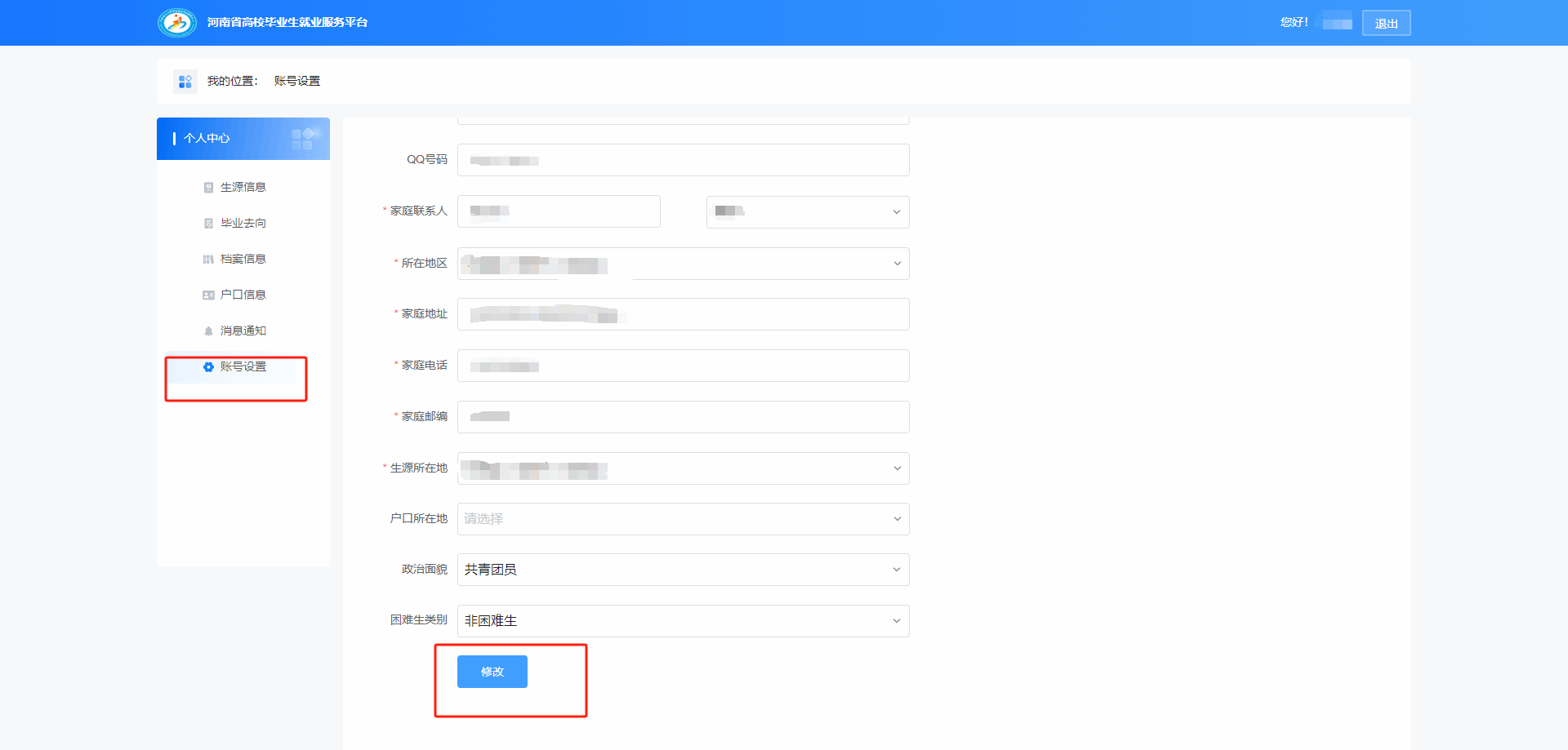 进入该页面,可以”查看”账号的信息,除了真实姓名、出生日期、所在院系和手机号码,其他信息均可以直接进行”修改”保存。