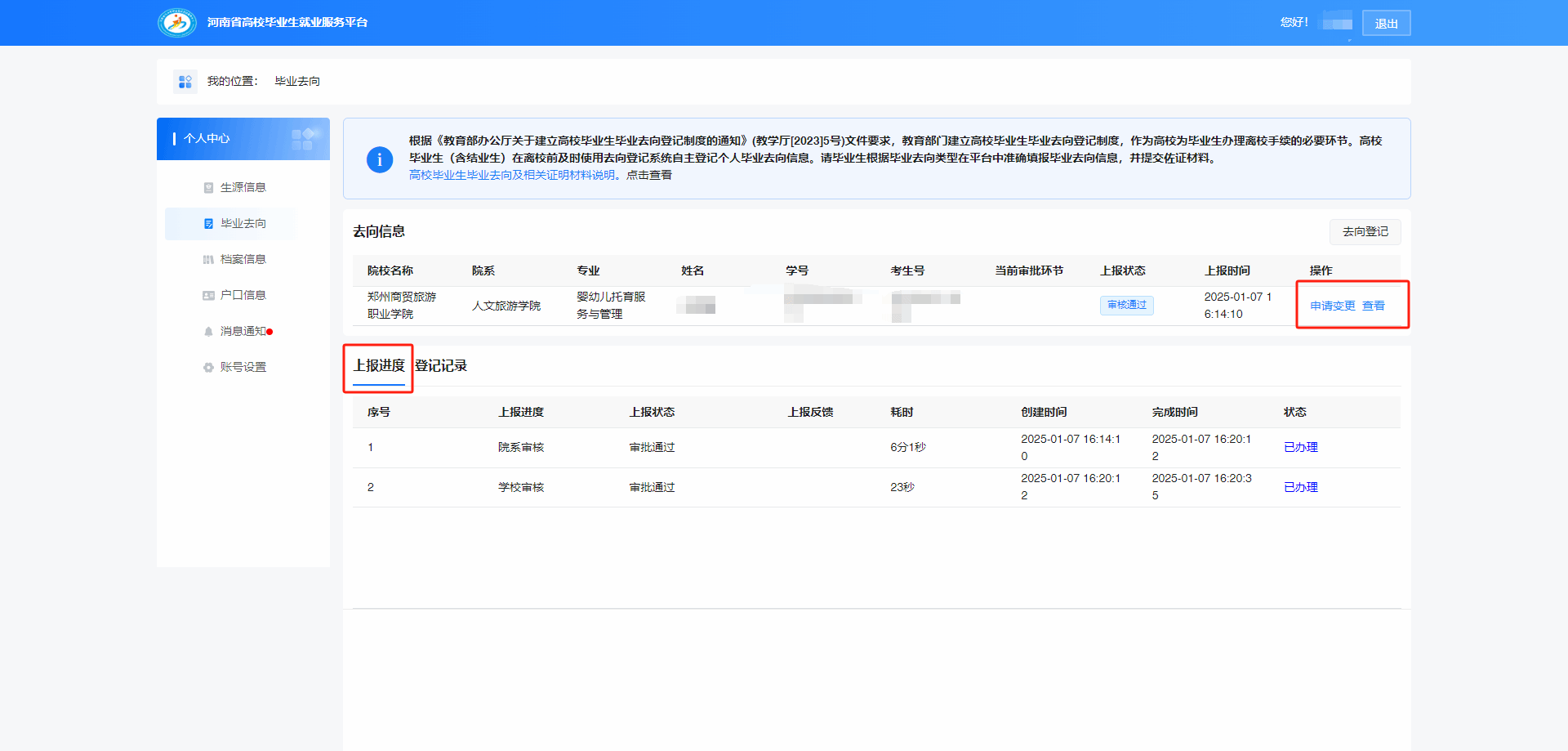 在提交之后毕业生可选择查看”查看”或者”撤回”进行重新申请,支持查看”上报进度”和”登记记录”的信息。