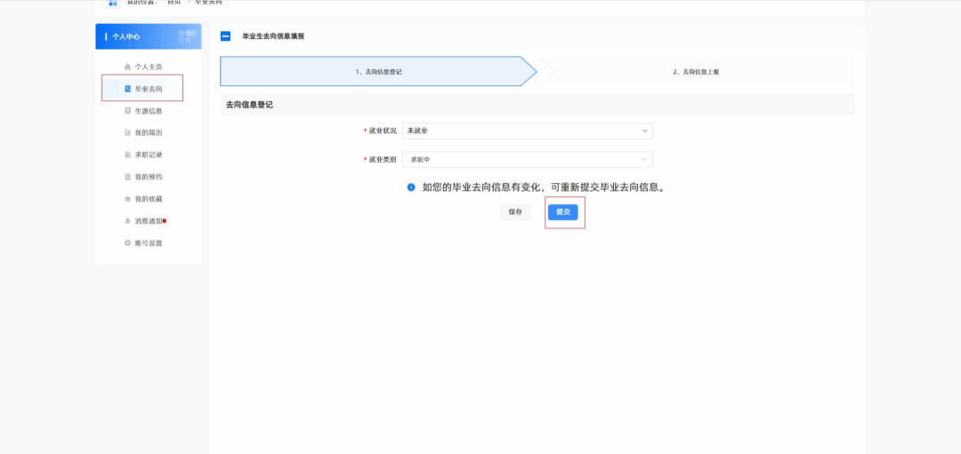 在这里毕业生需要根据自身的具体情况进行”去向信息的填写”,填写完毕后进行提交。