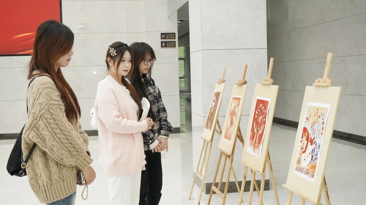 本次展览精心设置三大板块,多维呈现中华民族多元一体的文化长卷:一是创作展廊。精选以“石榴”为意象的师生原创作品,用色彩讲述各族文化交相辉映的故事;二是统战二十问。把“民族团结是什么”等20个高频疑问转化为通俗易懂的一问一答,在答题中完成政策法规科普;三是签名留影。师生签下名字并拍照留念,用指尖的温度传递“中华民族一家亲”的铮铮誓言。