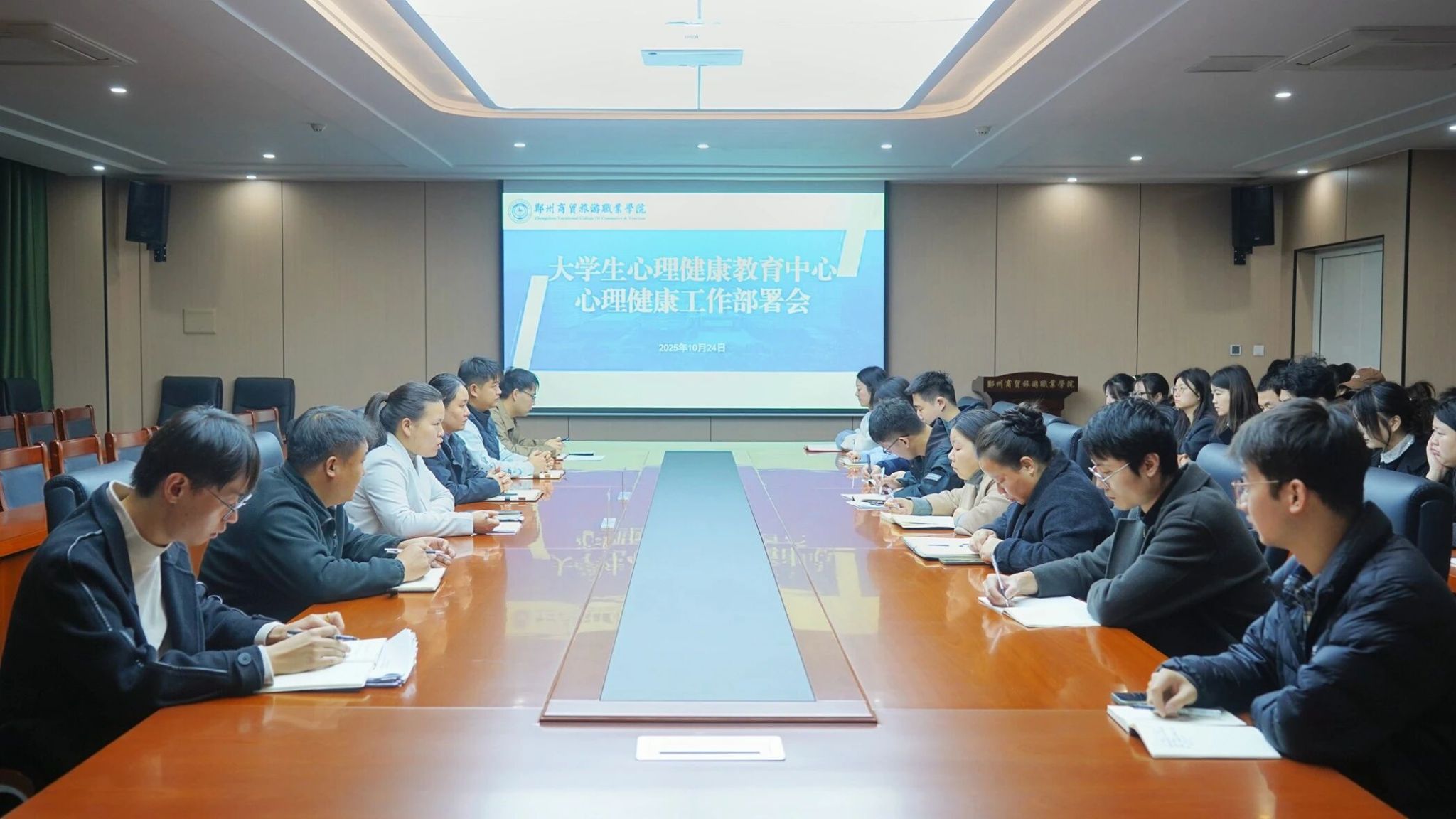 为全面落实心理健康教育工作要求,提升学生心理健康水平,筑牢校园心理安全防线,10月24日,我校在新密校区会议室召开心理健康工作部署会。校党委副书记刘冰倩出席会议并讲话,大学生心理健康教育中心主任焦秋芬主持会议。学生处相关负责人、各二级学院学管副院长、心理专干及全体辅导员参加会议。