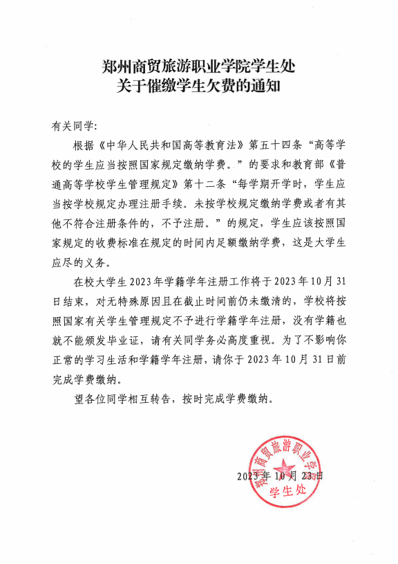 郑州商贸旅游职业学院学生处关于催缴学生欠费的通知