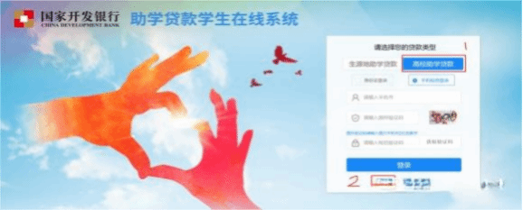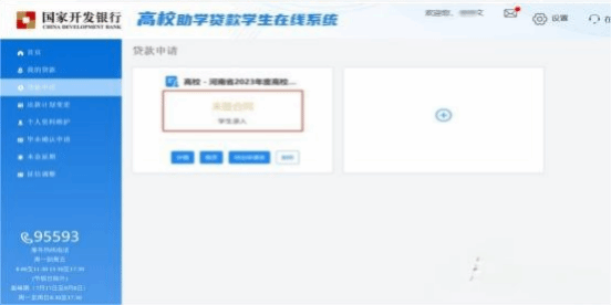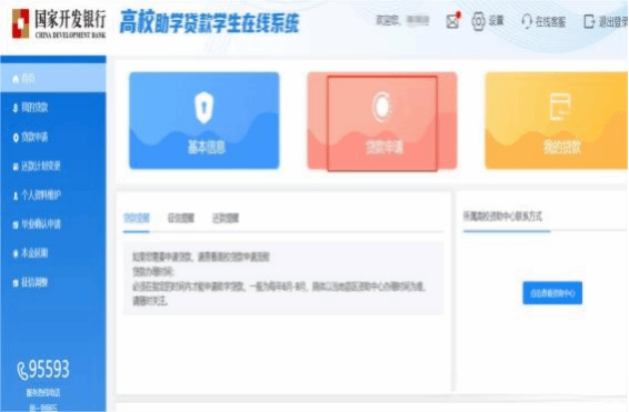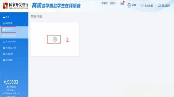 1.通过手机号登录国家开发银行学生在线服务系统 ,进入界面后选择贷 款申请。