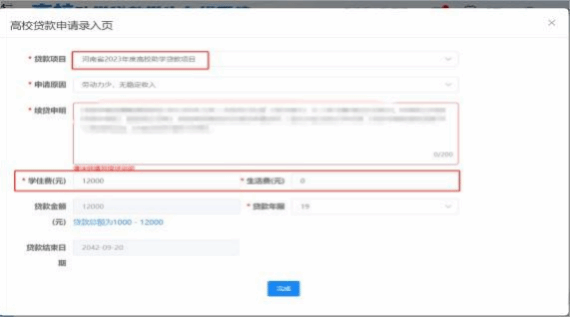 2. 确认贷款年度 ,选择贷款原因 ,在学住费栏填入本年度贷款总金额, 生活费栏填 0,贷款年限、贷款结束日期( 即贷款到期日期)根据学生所填年 级、学制自动生成。