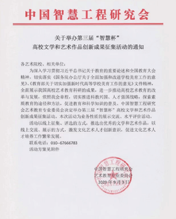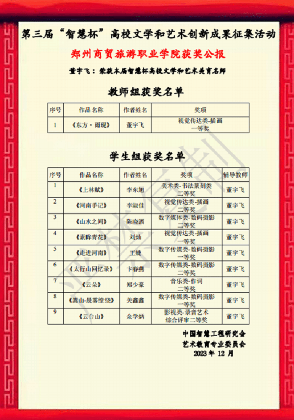由国务院批准、教育部主管的全国性组织——中国智慧工程研究会以及艺术教育专业委员会主办的第三届“智慧杯”高校文学和艺术作品创新成果征集活动大赛获奖名单公布,我校人文旅游学院喜获教师组一等奖一名,学生组一等奖三名,二等奖六名的优异成绩。