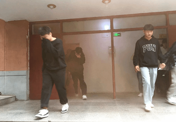 (二)紧急疏散演练,下午16:20烟起消防警铃响,辅导员组织学生有序逃离。