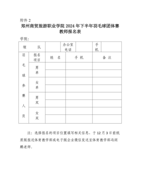 教师参赛队:教师自愿参加2024年郑州商贸旅游职业学院羽毛球赛的男单、女单、男双、女双,填写《郑州商贸旅游职业学院2024年羽毛球教师赛报名表》后报送至体育教学部。比赛采用单败淘汰赛模式,各单项参赛队≤4则单项取消。