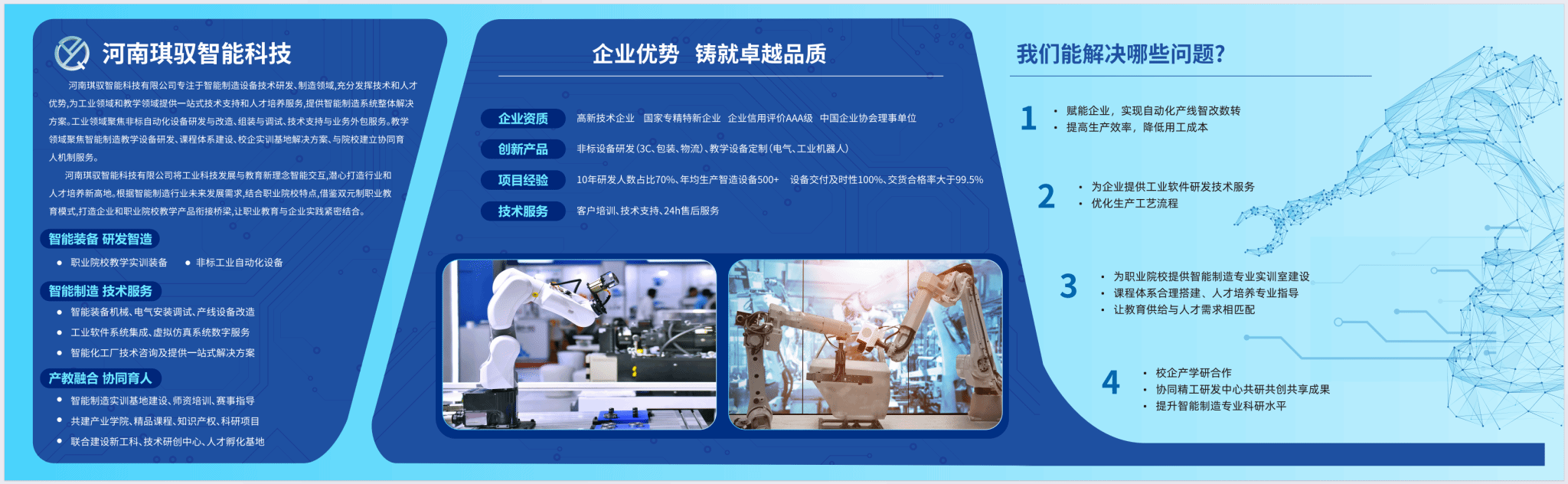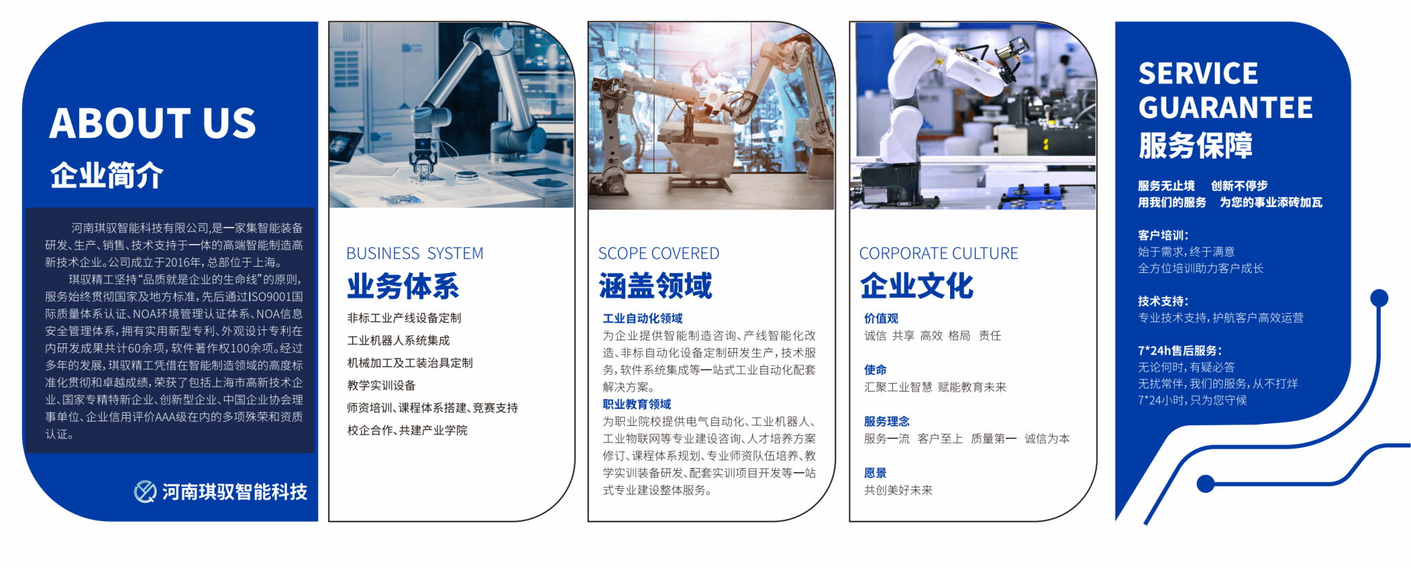 河南琪驭智能科技有限公司(以下简称“琪驭智能”)是一家集智能装备研发、生产、销售与技术服务于一体的国家级高新技术企业,总部位于上海,在郑州设立研发与制造中心。公司秉持“工业与教育双轮驱动”发展战略,深耕非标自动化设备定制、智能制造系统集成及产教融合服务,在工业机器人、机电一体化、工业互联网、机器视觉等领域具备深厚的技术积累与成熟的解决方案能力。