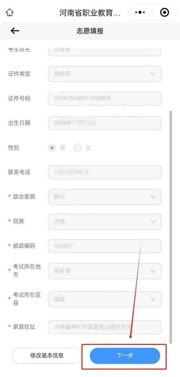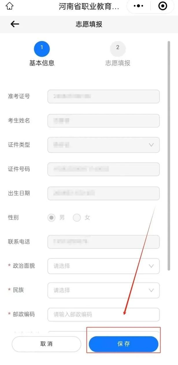 进入志愿填报页面点击“填报志愿”按钮,认真填写个人基本信息后点击“保存”按钮。