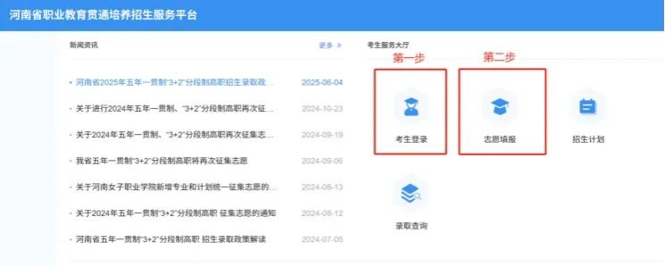 进入“河南省职业教育贯通培养招生服务平台”页面后,按照下面步骤操作: