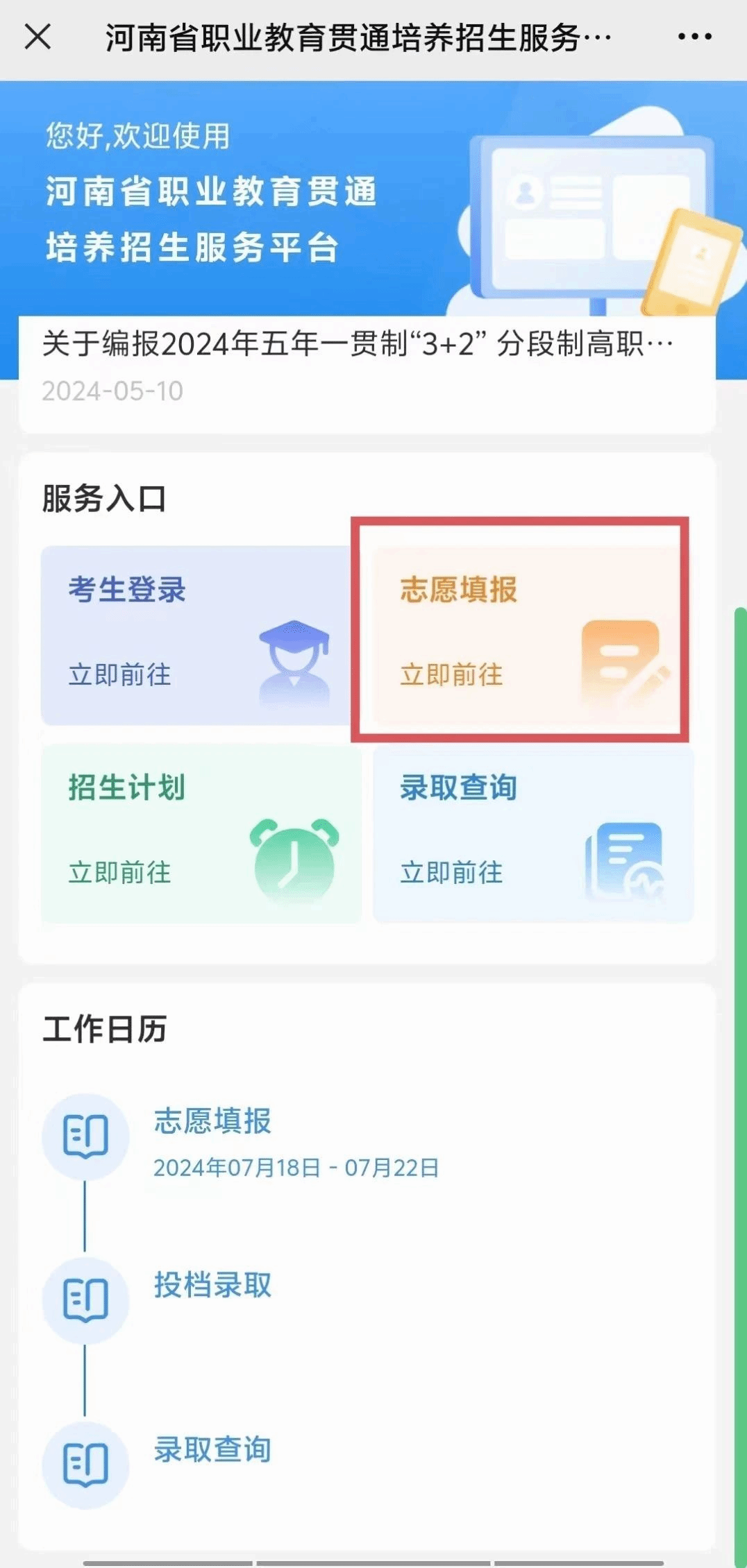 1.学生可通过“河南省职业教育贯通培养招生服务平台”(网址:http://zjgt.haeea.cn)(简称招生服务平台)进行网上志愿填报。