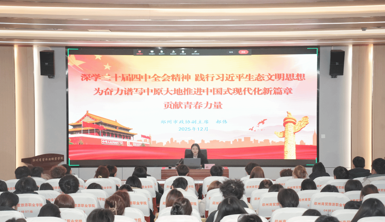 12月18日,郑州市政协副主席、民盟郑州市委会主委郝伟到郑州商贸旅游职业学院讲授思政课。学校领导班子成员、党政干部及师生代表现场聆听学习。