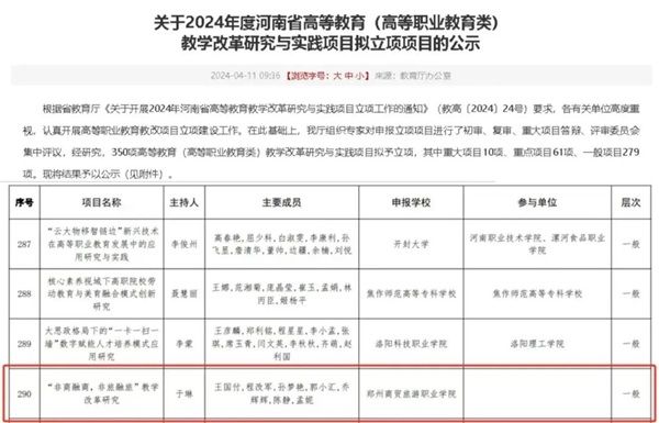 2024年4月11日,河南省教育厅下发了《关于2024年度河南省高等教育(高等职业教育类)教学改革研究与实践项目拟立项项目的公示》,我校财经商贸学院主持的《“非商融商,非旅融旅”教学改革研究》项目,列入拟立项建设名单。