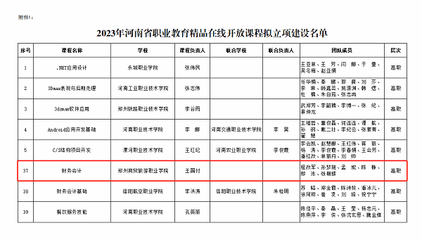 11月8日,河南省教育厅办公室下发了《关于2023年河南省职业教育和继续教育精品在线开放课程拟立项建设名单的公示》,我校财经商贸学院院长王国付教授主持的《财务会计》课程获得立项建设,实现了我校教学质量工程项目在省级层面的新跨越。